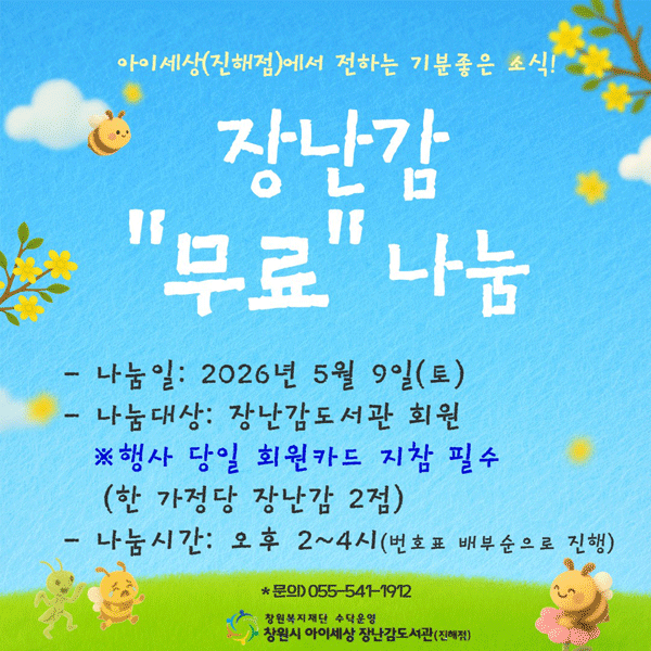 - 창원시 아이세상 장난감도서관(진해점) 보조인력 채용 공… 2026-04-15