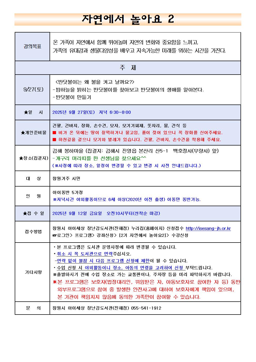 ※ 유의 사항 1. 모든 신청은 누리집(홈페이지)에서만 가능합니다. 2. 프로그램은 무료로 진행되며, 신청 시 신규 가정이 1순위, 1, 2기 참여한 가정은 2순위입니다. 3. 수업 신청시 연령 확인, 아동명, 생년월일, 보호자 전화번호 정확히 입력해주세요. 신청시 대표아동명에 참가 아동수를 표기해주세요. (예)홍길동2, 홍길순3 4. 아이들과 많이 걸어야 하는 야간 야외 체험 활동입니다. ※6세 미만 유아는 참여가 어려운 점 유념하시어 신청해주시길 바랍니다. 5. 많은 분들께서 참여하고 싶어하는 수업으로 당일 취소 할 경우 대기자 선정이 어렵습니다. 다른 분들이 참여 할 수 있도록 취소 할 경우 미리 도서관으로 연락 주십시오. 6. 본 프로그램 일정은 도서관 운영 상황에 따라 변동 될 수 있습니다. ※ 전화번호 잘못 입력 시 수강 안내 문자 누락될 수 있으니 잘못 입력 시 도서관으로 반드시 연락 주시길 바랍니다 |