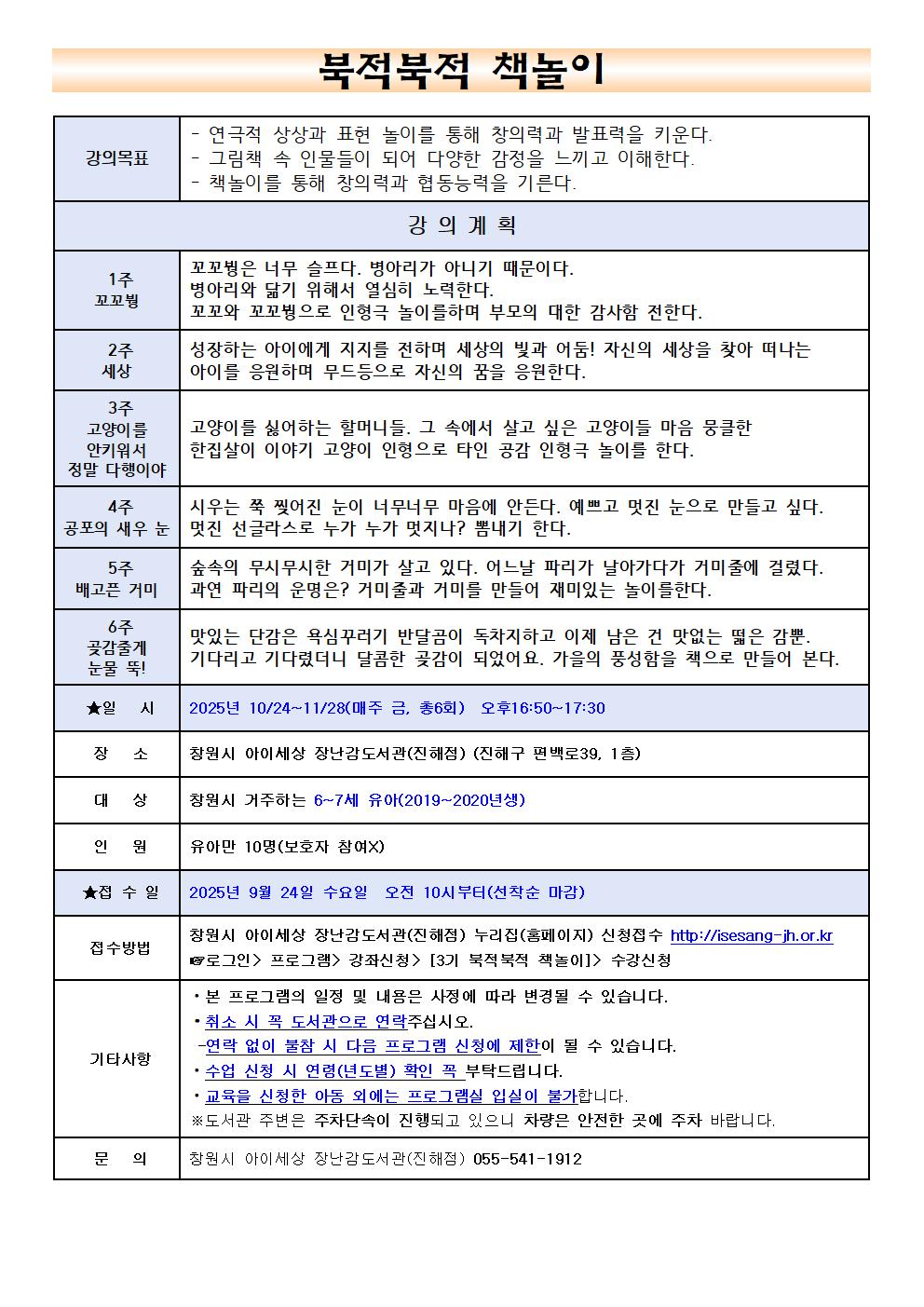 2. 프로그램은 무료로 진행되며, 신청 시 신규아동이 1순위,  1,2기수업 진행한 아동은 2순위입니다.