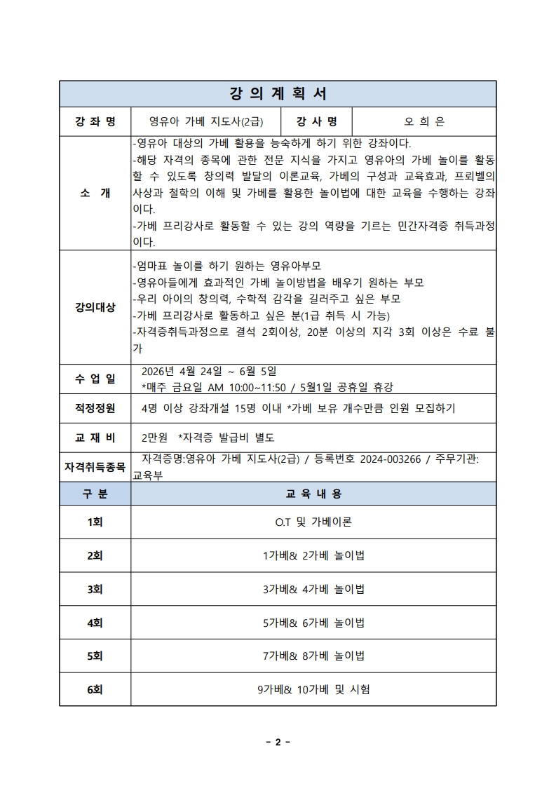 | 강좌명 | 영유아가베지도사 2급 |