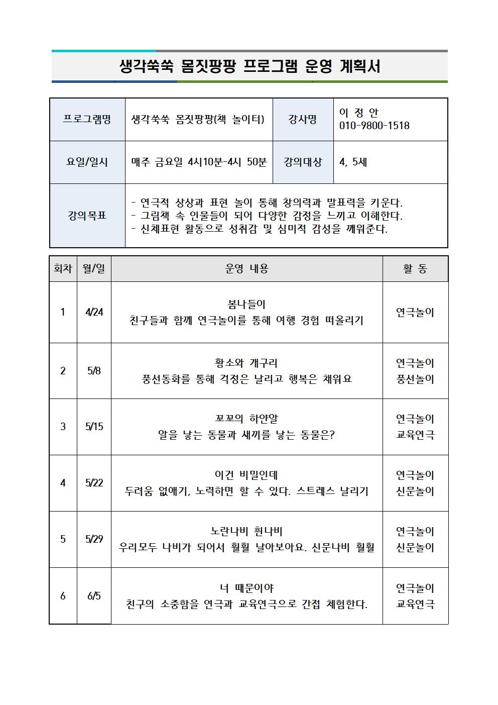 | 진행기간 | 2026년 04월 24일~2026년 06월 05일 금요일 16:10~16:50 6 회 |